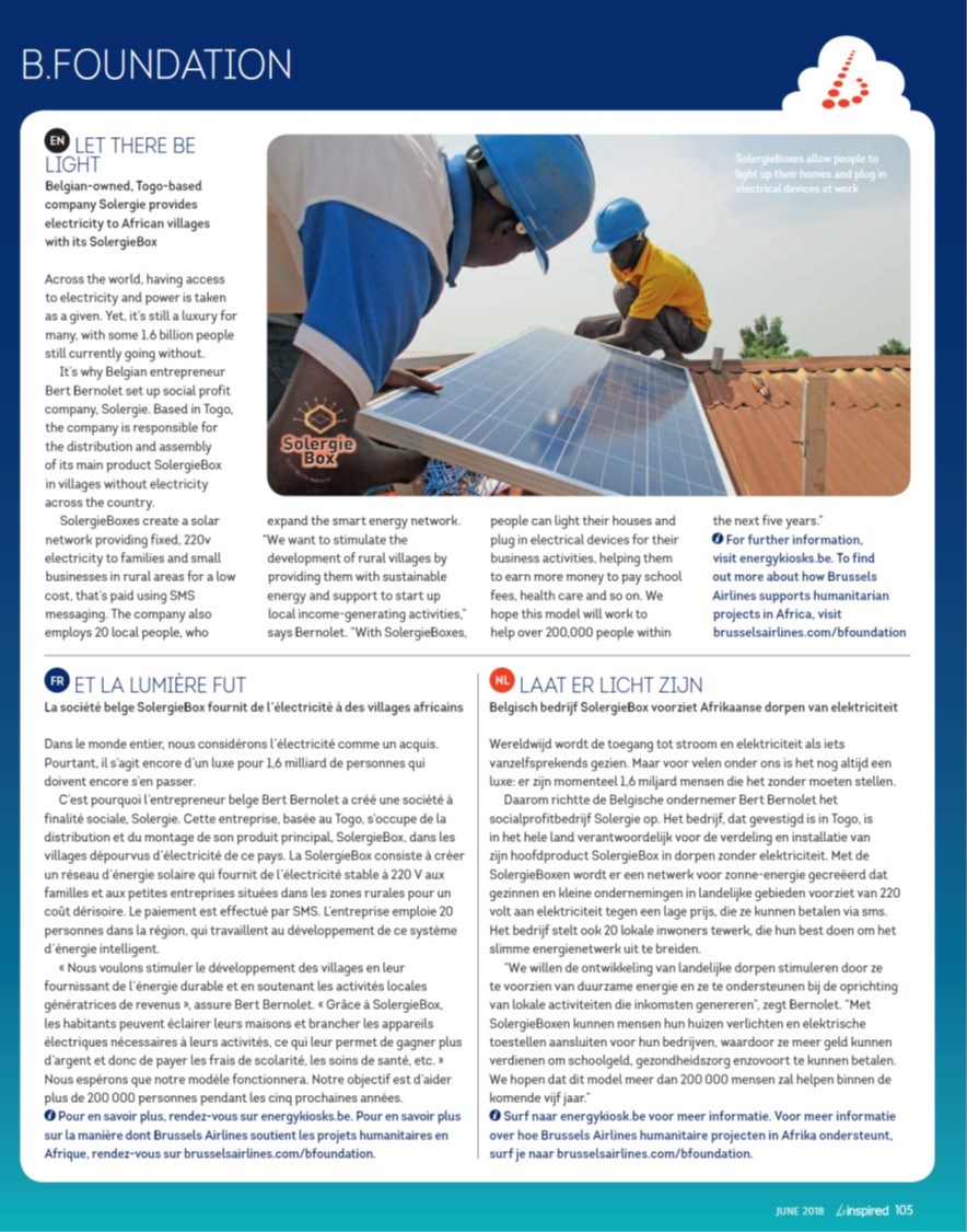 Solergie a été sélectionnée par le gouvernement togolais pour faire partie de sa stratégie d'électrification du Togo à 100% d'ici 2030. Solergie a ainsi obtenu une licence pour 15 ans comprenant une exonération des taxes à l'importation, de la TVA et une subvention de 3 euros par mois et par client. Cela stimulera l'expansion au Togo dans les années à venir!